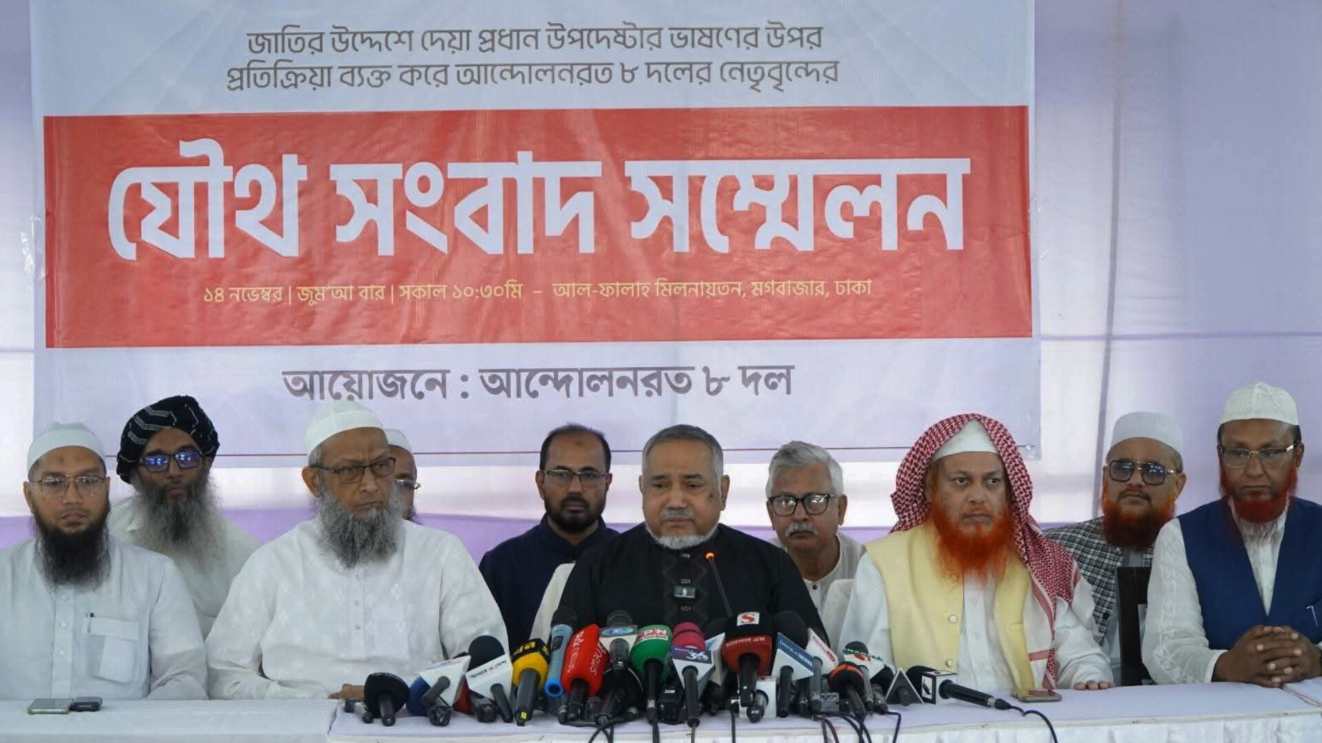 রাজধানী ঢাকার মগবাজারস্থ আল-ফালাহ মিলনায়তনে আজ ১৪ নভেম্বর (শুক্রবার) সকাল ১০টা ৩০ মিনিটে আন্দোলনরত আটটি রাজনৈতিক দলের উদ্যোগে এক যৌথ সংবাদ সম্মেলন অনুষ্ঠিত হয়েছে। গত ১৩ নভেম্বর প্রধান উপদেষ্টার জাতির উদ্দেশে দেওয়া ভাষণের প্রতিক্রিয়ায় আট দলের অভিন্ন দৃষ্টিভঙ্গি তুলে ধরা হয়। সম্মেলনে জামায়াতে ইসলামীর নায়েবে আমীর ও সাবেক সংসদ সদস্য ডা. সৈয়দ আব্দুল্লাহ মোঃ তাহের সাংবাদিকদের সামনে বিস্তারিত বক্তব্য প্রদান করেন এবং বিভিন্ন প্রশ্নের উত্তর দেন।