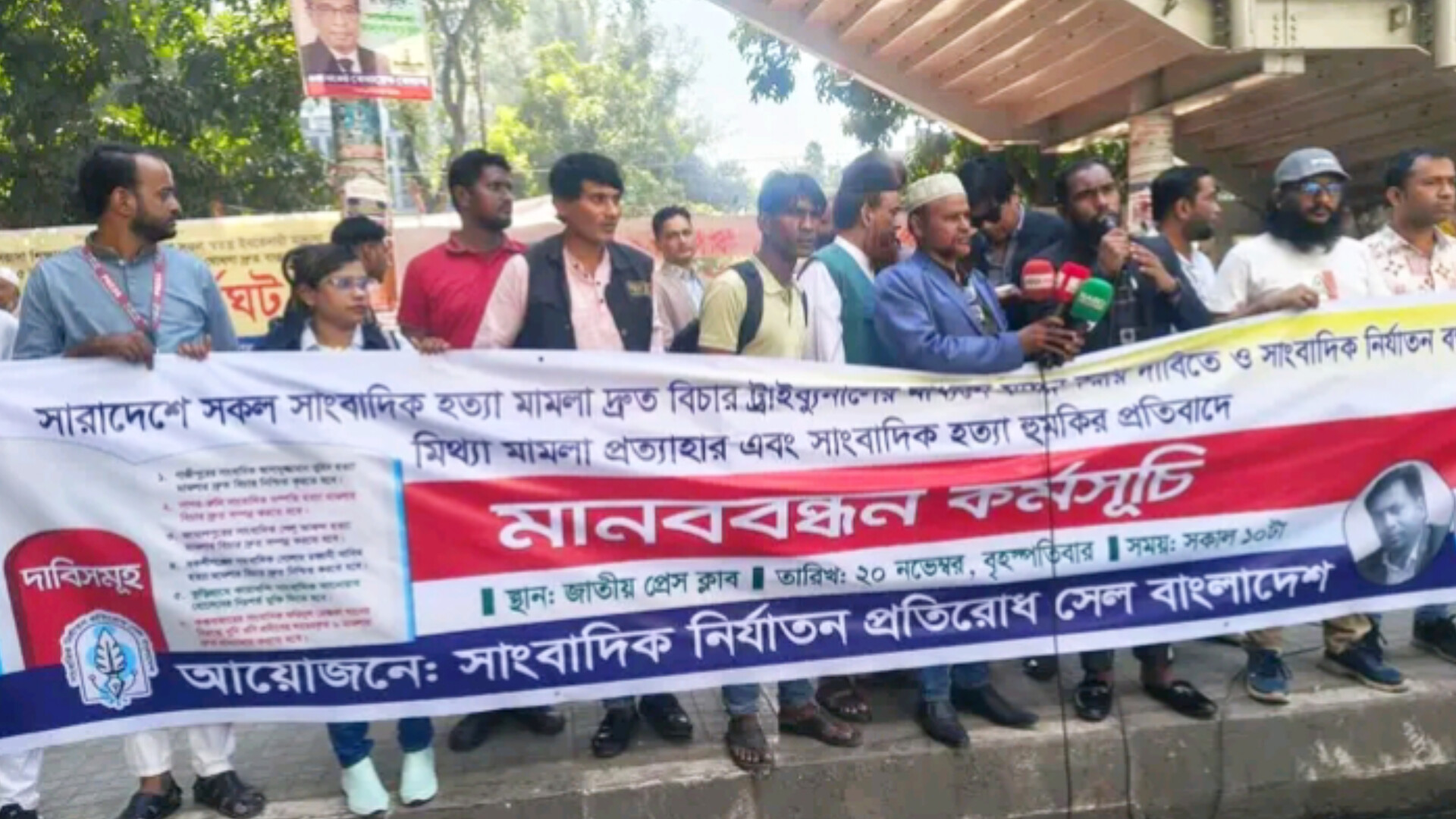 সাংবাদিক নির্যাতন, হত্যা ও মিথ্যা মামলার দ্রুত নিষ্পত্তির দাবিতে মানববন্ধন অনুষ্ঠিত হয়েছে জাতীয় প্রেসক্লাবের সামনে। বৃহস্পতিবার (২০ নভেম্বর) সকালে সাংবাদিক নির্যাতন প্রতিরোধ সেল বাংলাদেশ আয়োজিত এই মানববন্ধনে দেশের বিভিন্ন অঞ্চলের সাংবাদিকরা অংশ নেন। তারা সাংবাদিকদের নিরাপত্তা নিশ্চিত ও হত্যার বিচার দ্রুত ট্রাইব্যুনালের মাধ্যমে সম্পন্নের আহ্বান জানান।
