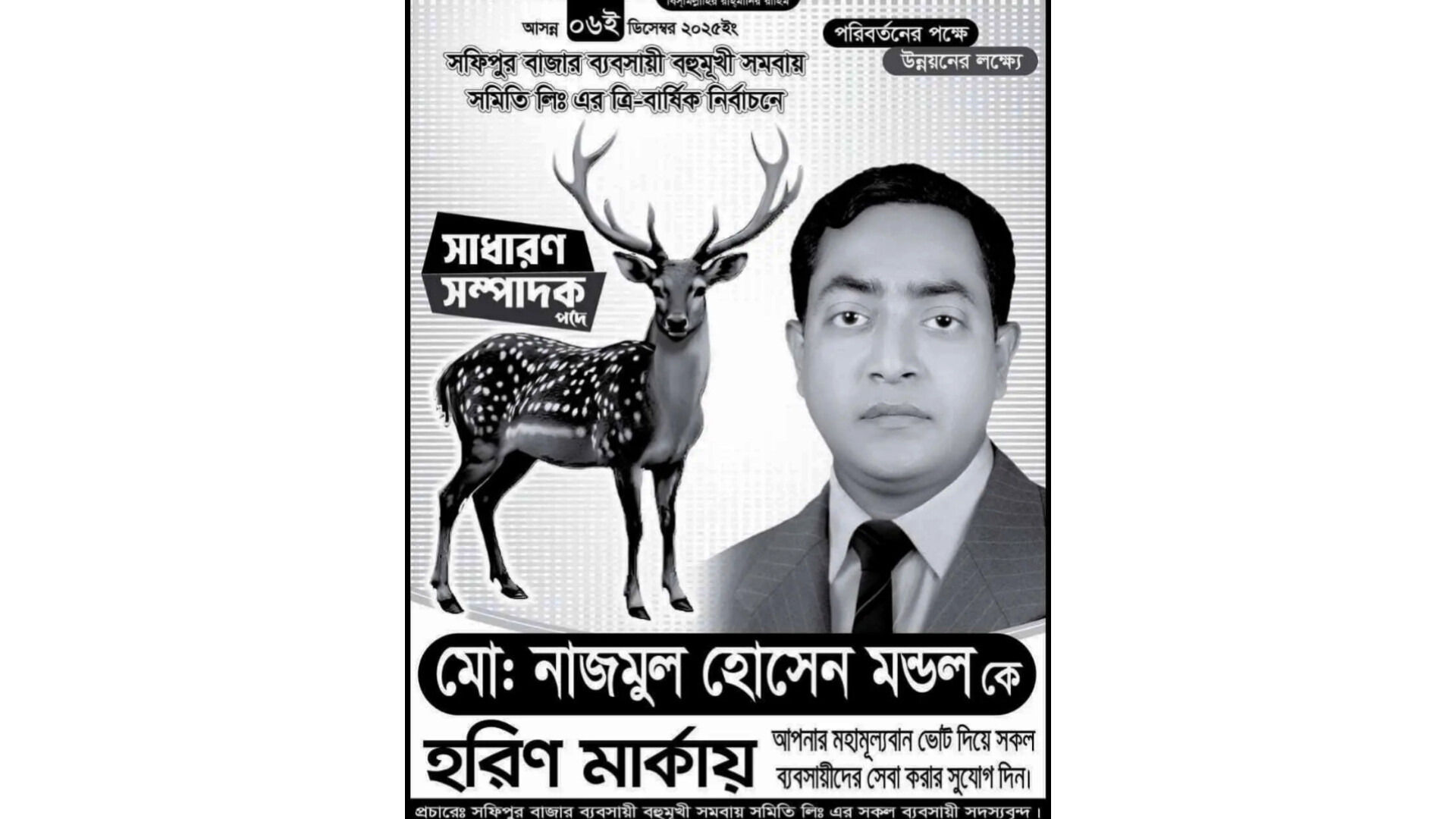 আসন্ন ৬ ডিসেম্বর অনুষ্ঠিতব্য সফিপুর বাজার ব্যবসায়ী বহুমুখী সমবায় সমিতি লিঃ–এর ত্রি-বার্ষিক নির্বাচনকে কেন্দ্র করে বাজারজুড়ে বিরাজ করছে এক ভিন্ন রকমের প্রাণচাঞ্চল্য। আলোচনা, প্রত্যাশা আর নতুন স্বপ্নে মুখরিত ব্যবসায়ী সমাজ। এরই সূত্র ধরে সাধারণ সম্পাদক পদে প্রতিদ্বন্দ্বিতা করছেন মো. নাজমুল হোসেন মন্ডল—যিনি ইতোমধ্যেই ব্যক্তিগত জনপ্রিয়তা, সততা এবং মানুষের প্রতি আন্তরিকতার জন্য ব্যবসায়ীদের কাছে বিশেষ আস্থা অর্জন করেছেন।
