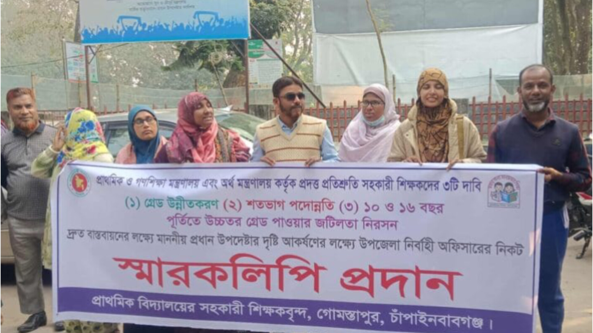 সহকারী শিক্ষকরা । বুধবার দুপুর তিনটায় গোমস্তাপুর উপজেলা চত্বরে মানববন্ধন শেষে স্মারকলিপি প্রদান করা হয় । মানববন্ধনে বক্তব্য রাখেন আলিনগর সরকারি প্রাথমিক বিদ্যালয় সহকারী শিক্ষক মোঃ রুহুল আমিন শিহাব, সহকারী শিক্ষক রুহুল আমিন, সাদিকুল ইসলাম, নাজমী খাতুন, উম্মে আবেহা, হারুন অর রশিদ, বজলুর বারী, খাইরুল বারী প্রমুখ।